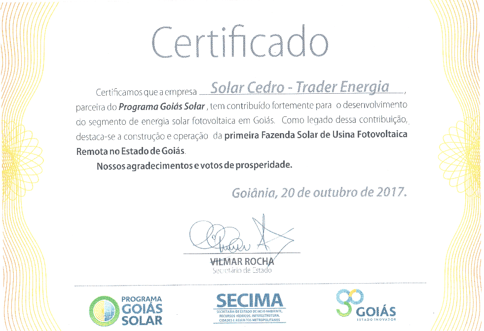 CERTIFIED AS 1ST SOLAR FARM IN GOIáS STATE - BRAZIL